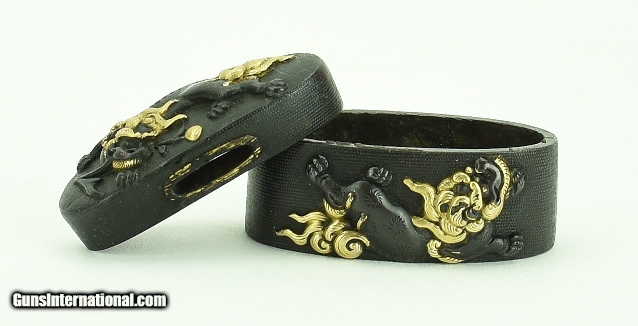 Description: "Kinko Fuchi Kashira. Shakudo nanako ground. Shi-Shi motif. Shakudo and gold high relief Unsigned. Katana size. SOLD |