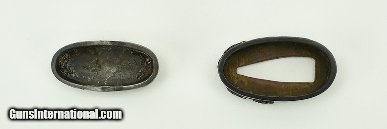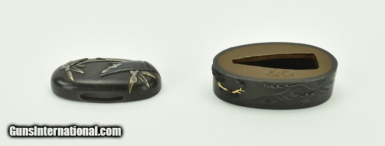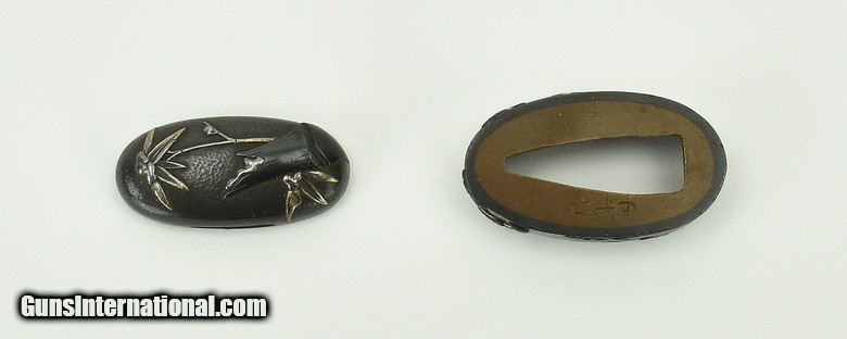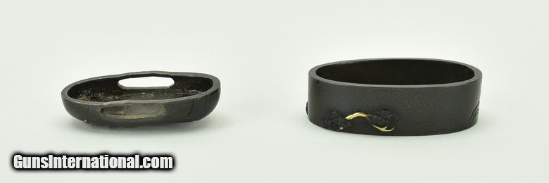 Description: "Kinko Fuchi Kashira. Shakudo stone ground. Silver and gold highlights. Signed: Konju. Early 19th century personal name Iwamoto Kyugoro. Pupil of Iwamoto Konkwan Baur, P. 381. SOLD |