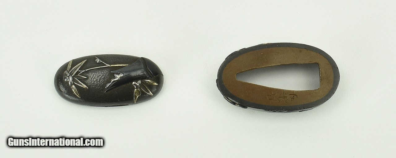 Description: "Kinko Fuchi Kashira. Shakudo stone ground. Silver and gold highlights. Signed: Konju. Early 19th century personal name Iwamoto Kyugoro. Pupil of Iwamoto Konkwan Baur, P. 381. SOLD |