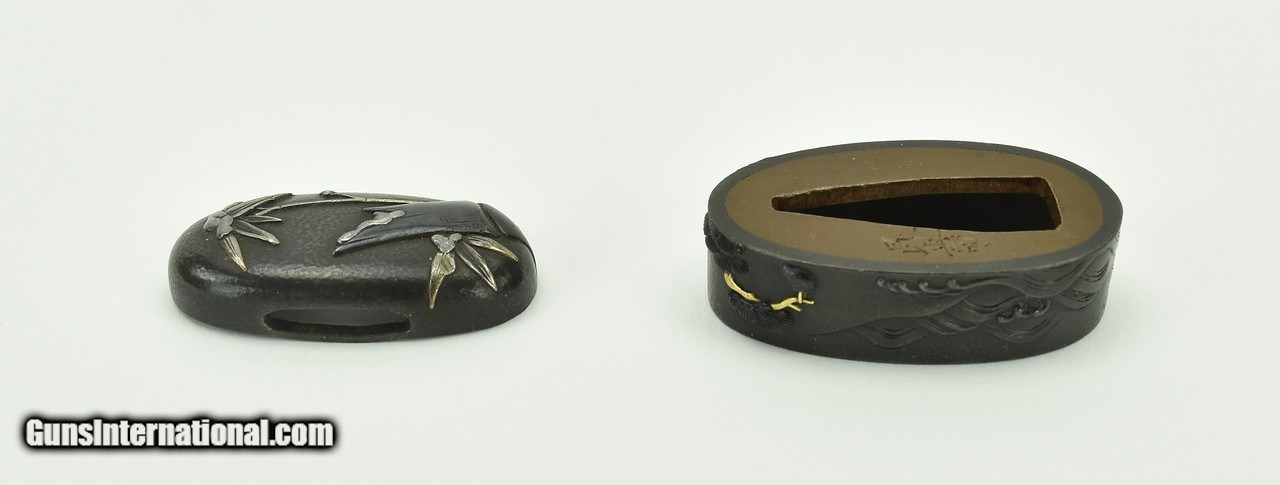 Description: "Kinko Fuchi Kashira. Shakudo stone ground. Silver and gold highlights. Signed: Konju. Early 19th century personal name Iwamoto Kyugoro. Pupil of Iwamoto Konkwan Baur, P. 381. SOLD |