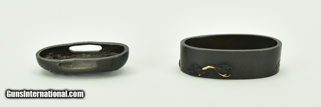 Description: "Kinko Fuchi Kashira. Shakudo stone ground. Silver and gold highlights. Signed: Konju. Early 19th century personal name Iwamoto Kyugoro. Pupil of Iwamoto Konkwan Baur, P. 381. SOLD |