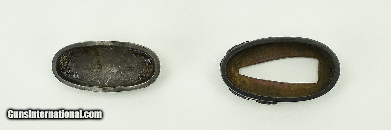 Description: "Kinko Fuchi Kashira. Shakudo stone ground. Silver and gold highlights. Signed: Konju. Early 19th century personal name Iwamoto Kyugoro. Pupil of Iwamoto Konkwan Baur, P. 381. SOLD |