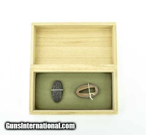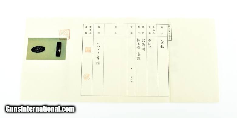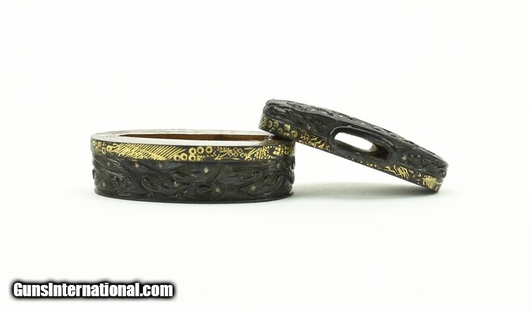Description: "Kinko Fuchi Kashira. Shakudo waves with gold spray. This set has gold rims decorated with intricate gold designs. Unsigned but attributed by N.B.T.H.K. to Kaga School. Very unusual high quality work. SOLD |