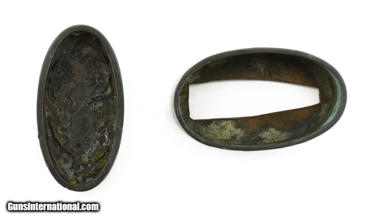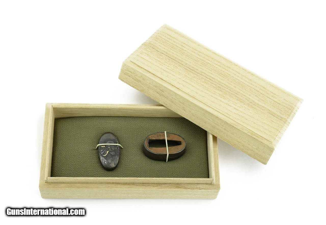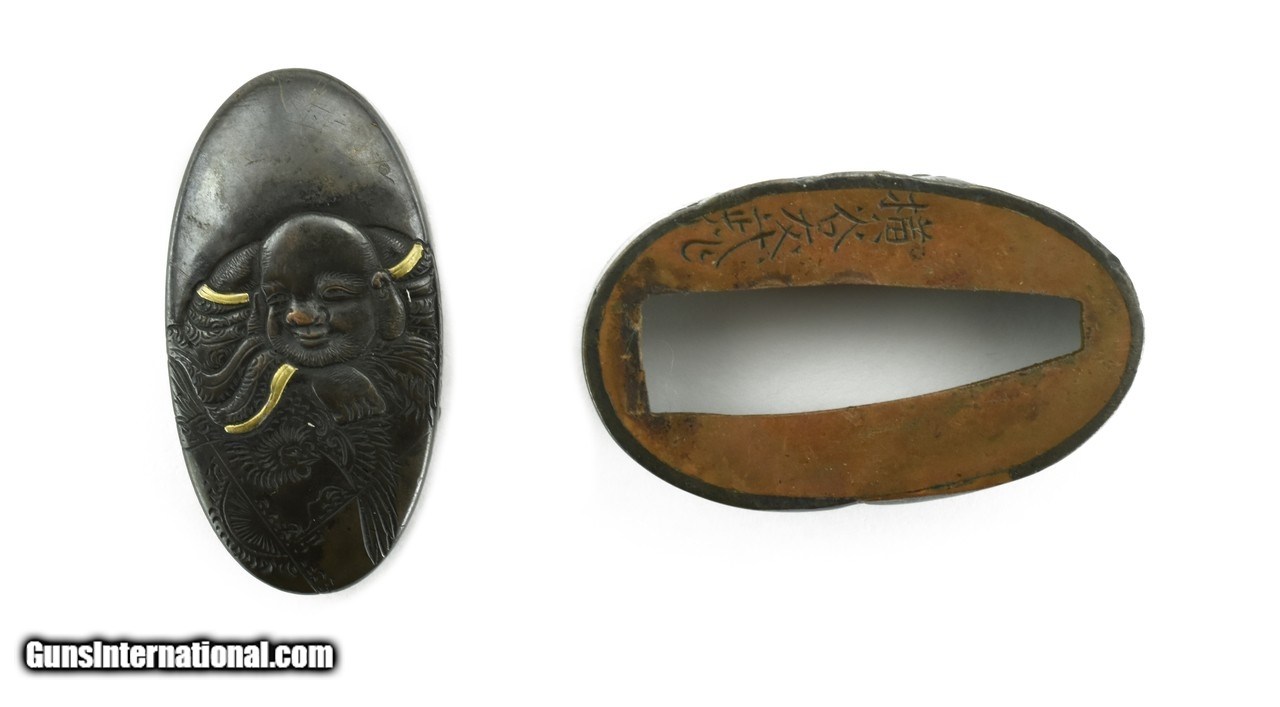 Description: "Kinko Fuchi Kashira. Polished Shakudo ground. Figures in repose. One figure holding fan. Gold highlights. Signed: Tomo Take (Kao). Boxed. SOLD |