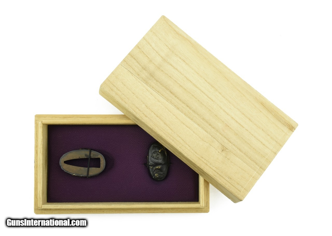 Description: "Kinko Fuchi Kashira. Faces of smiling children with flowers with gold highlights. Unsigned. Boxed. Fly wisk on Fuchi and on Kashira smiling girl holding a scroll. SOLD |