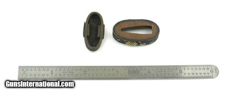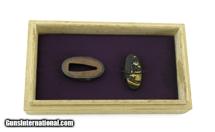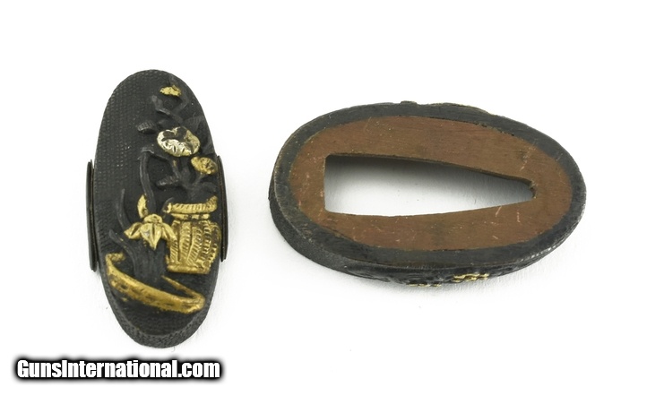 Description: "Kinko Fuchi Kashira. Shakudo nanako ground. Gold baskets with flowers. Gold and silver highlights. Unsigned. Boxed. SOLD |