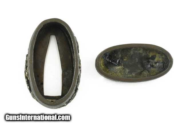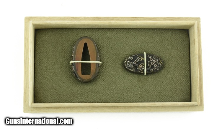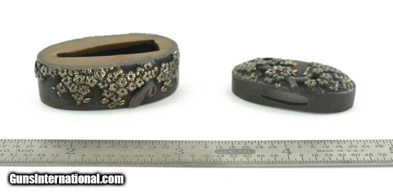 Description: "Kinko Fuchi Kashira. Shakudo nanako ground. Theme of cherry blossoms with gold, silver and copper highlights. Unsigned. Boxed. SOLD |