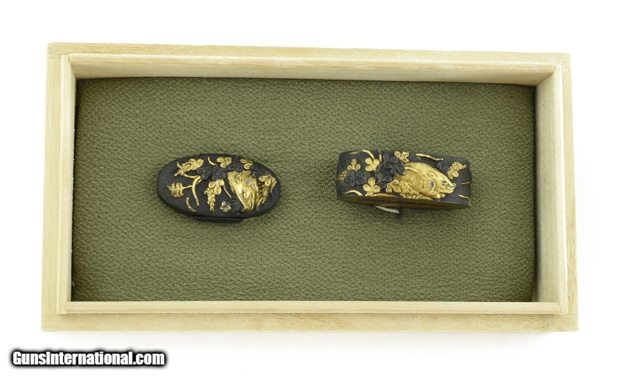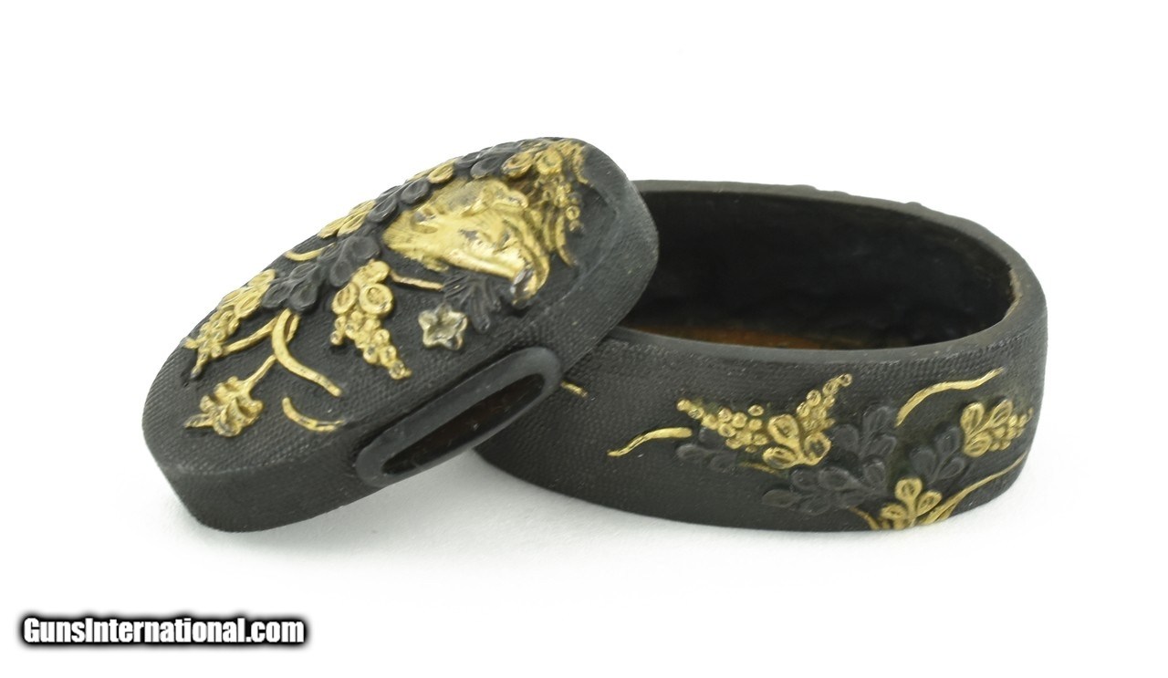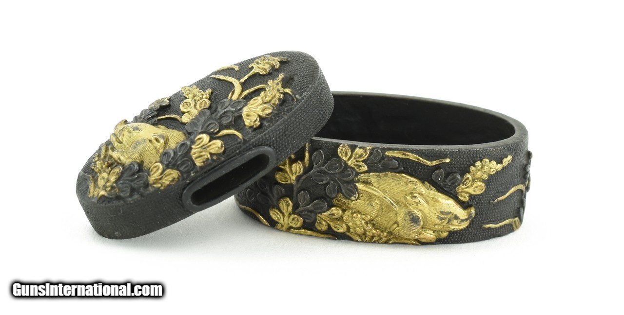 Description: "Kinko Fuchi Kashira. Shakudo nanako ground. Motif of gold boars running through foliage. Excellent detail. Unsigned. Boxed. Very attractive. SOLD |