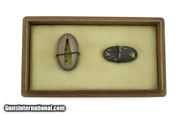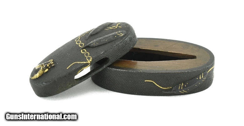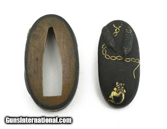 Description: "Kinko Fuchi Kashira. Shakudo nanako ground. Feather and mouse with gold strings. SOLD |