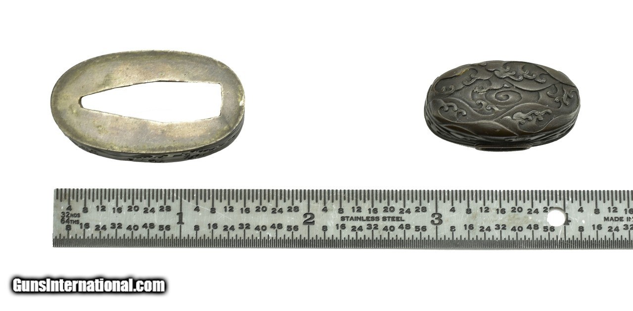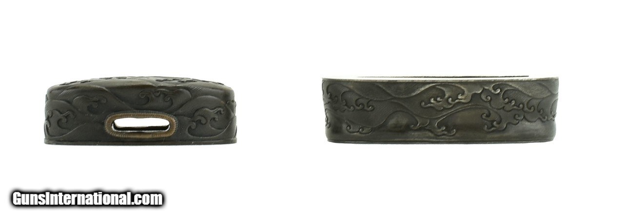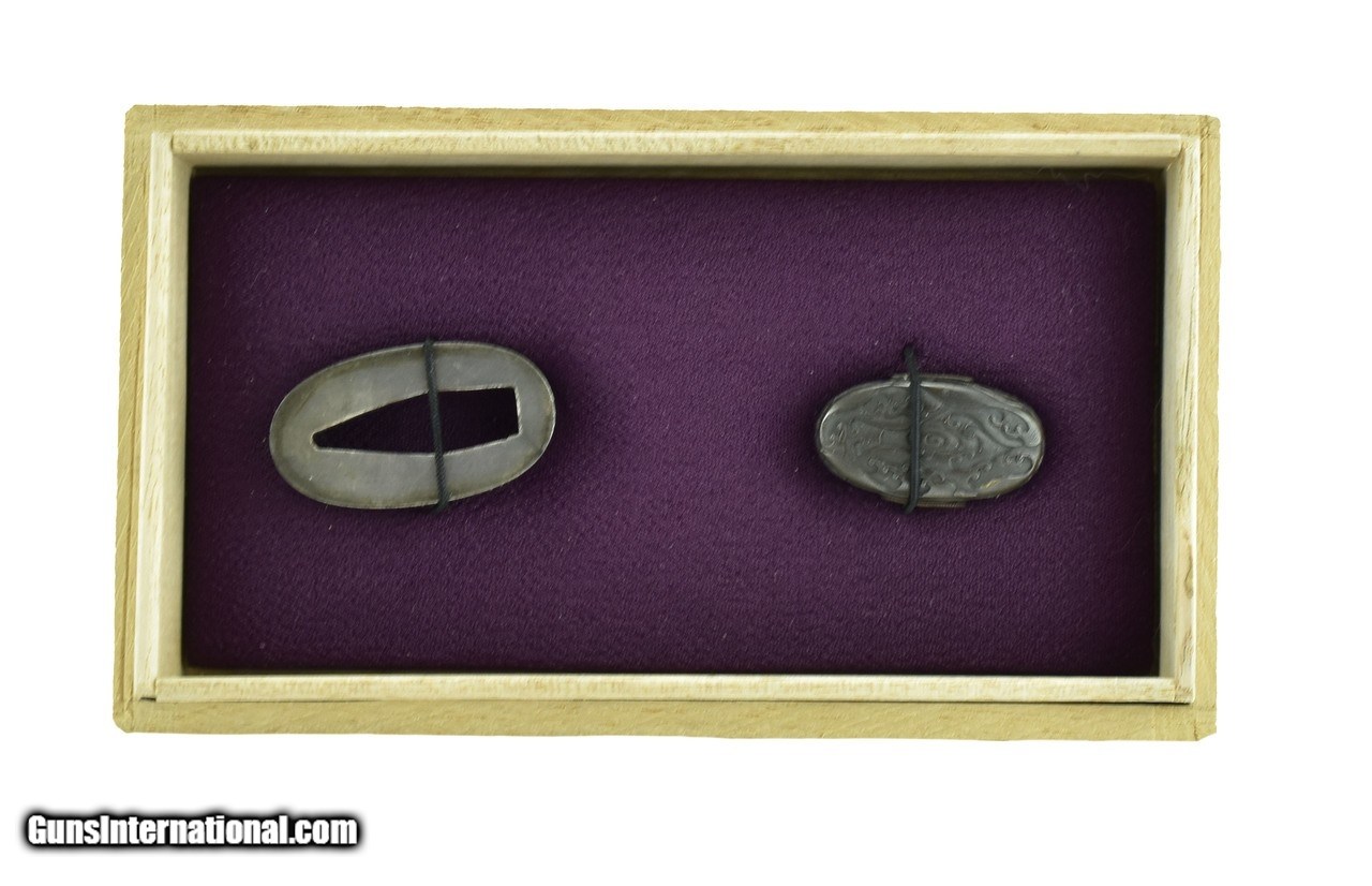 Description: "Kinko Fuchi Kashira. Shakudo ishmei ground. Village scene with gold highlights. Signed. Boxed. SOLD |