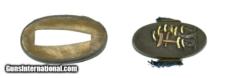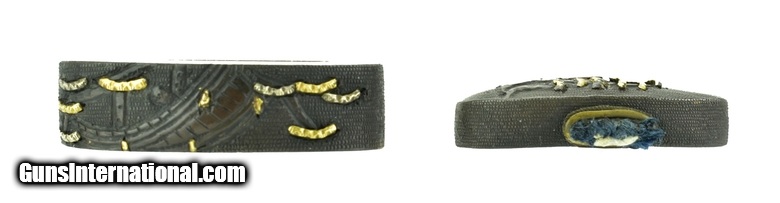 Description: "Kinko Fuchi Kashira. Shakudo nanako ground. Structures with foliage of gold, silver, and copper highlights. Boxed. Unsigned. SOLD |