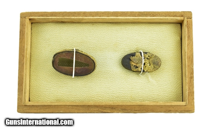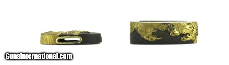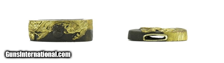 Description: "Kinko Fuchi Kashiro. Shakudo nanako ground. Gold birds amidst turbulent waves. Unsigned. Boxed. SOLD |