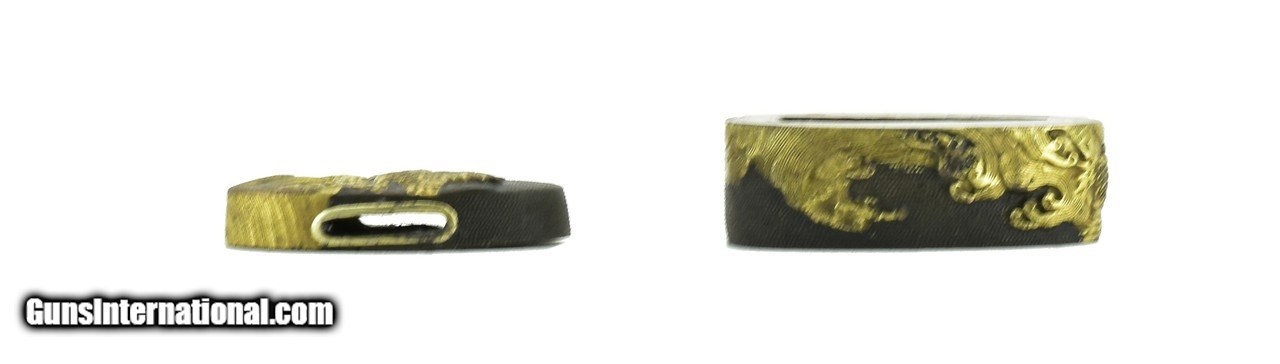 Description: "Kinko Fuchi Kashiro. Shakudo nanako ground. Gold birds amidst turbulent waves. Unsigned. Boxed. SOLD |