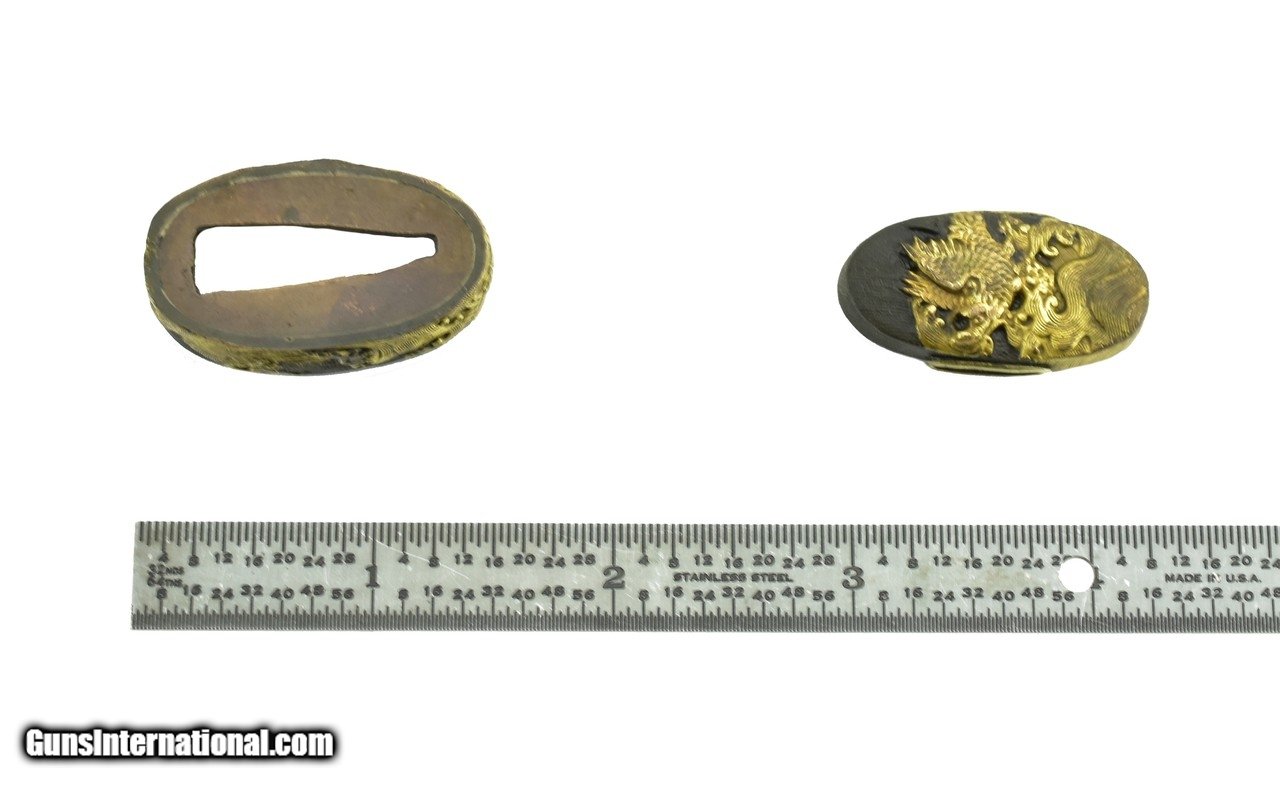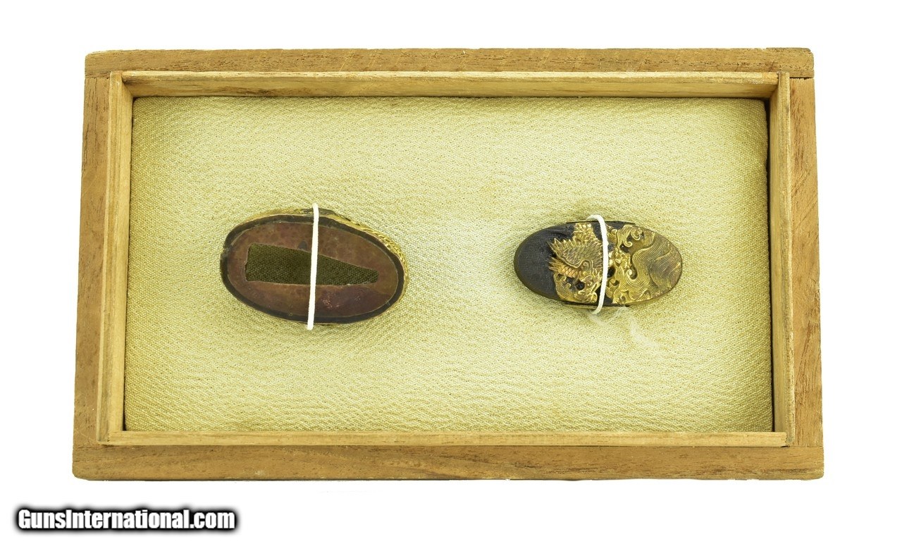 Description: "Kinko Fuchi Kashiro. Shakudo nanako ground. Gold birds amidst turbulent waves. Unsigned. Boxed. SOLD |