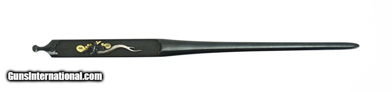 Description: "Kinko Kodzuka and Kogai pair. Esquisite workmanship on very fine Shakudo Nanako ground. Decorated with Daikon (Radishes) and leaves in Iroe Takazogan. Signed: Mifu Ju Tamagawa Yoshi Hisa with Hozon Tokubetsu N.B.T.H.K Papers. Paper Issued in 1983 which indicates sword fitting worthy of preserving. SOLD |