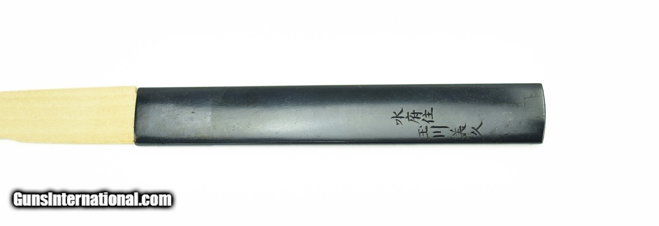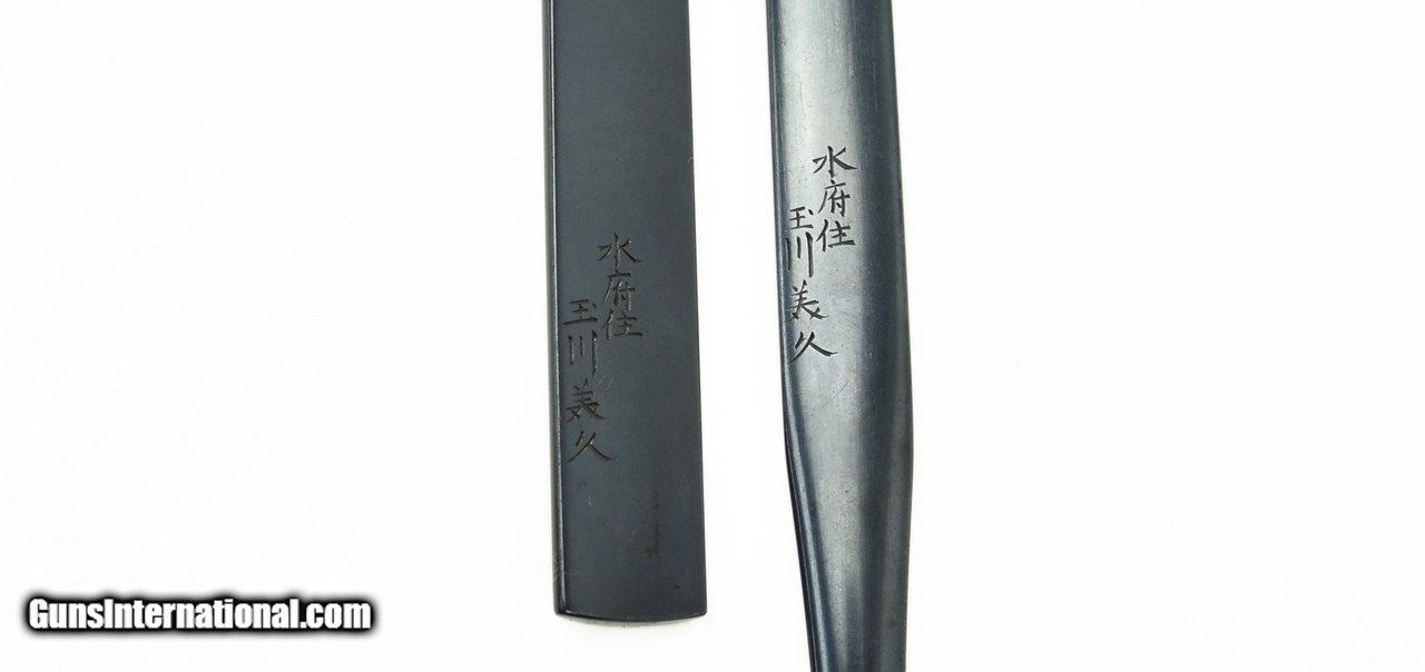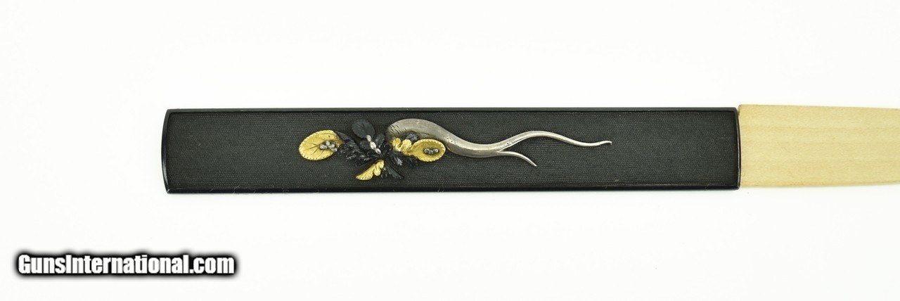 Description: "Kinko Kodzuka and Kogai pair. Esquisite workmanship on very fine Shakudo Nanako ground. Decorated with Daikon (Radishes) and leaves in Iroe Takazogan. Signed: Mifu Ju Tamagawa Yoshi Hisa with Hozon Tokubetsu N.B.T.H.K Papers. Paper Issued in 1983 which indicates sword fitting worthy of preserving. SOLD |