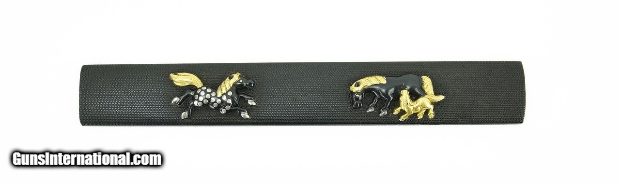 Description: "Kinko Kodzuka. Galloping horses with gold, silver, and Shakudo highlights. Shakudo Nanako ground. Goto School. Signed Sokujo Saku, Mitsushige with Kao (on edge). Horses also carved on reverse. Excellent condition. SOLD |