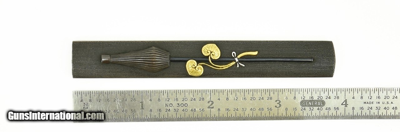 Description: "Kinko Kodzuka. Shakudo Nanako ground. Folded Parasol with Tendrils and Leaves attached to a shaft by silver bow. Excellent condition. Signed Goto with Kao. SOLD |