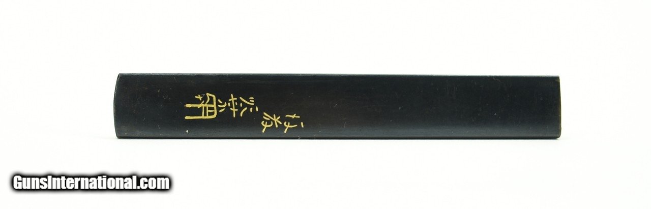 Description: "Kinko Kodzuka. Shakudo Nanako ground. Folded Parasol with Tendrils and Leaves attached to a shaft by silver bow. Excellent condition. Signed Goto with Kao. SOLD |