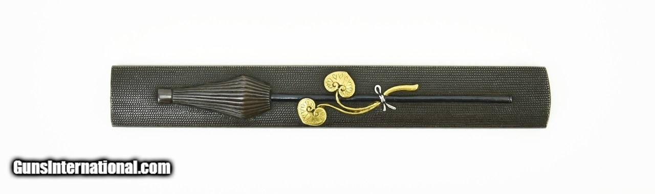 Description: "Kinko Kodzuka. Shakudo Nanako ground. Folded Parasol with Tendrils and Leaves attached to a shaft by silver bow. Excellent condition. Signed Goto with Kao. SOLD |