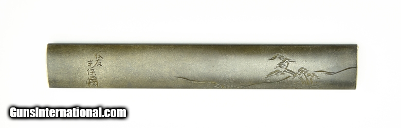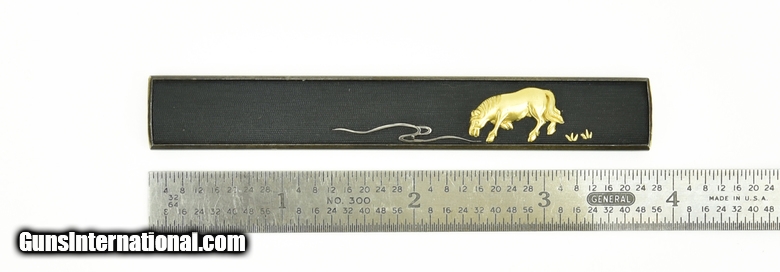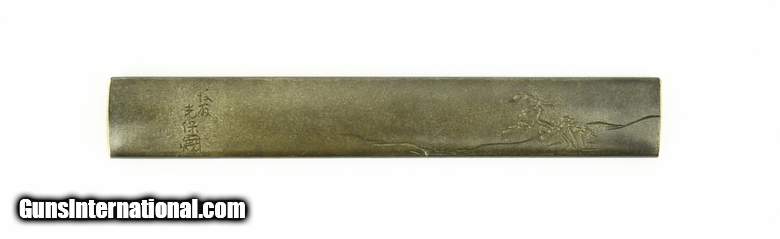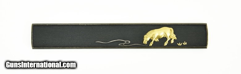 Description: "Kinko Kodzuka. Shakudo Nanako ground. Grazing gold horse by stream with foliage. Reverse has trees and mountain. Signed: Goto Mitsu Yasu (1794-1851). Kinko Meikan Page 508a. Superior quality. SOLD |