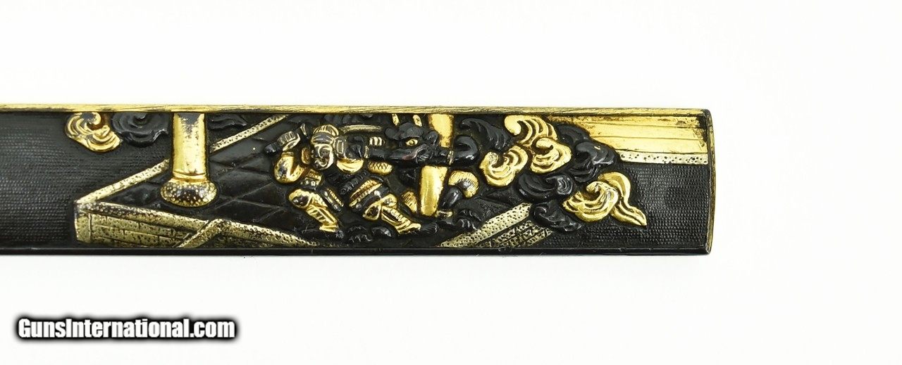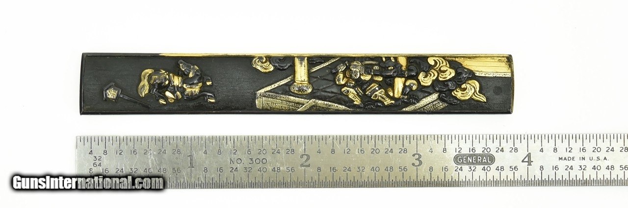 Description: "Kinko Kodzuka. Shakudo Nanako ground. Scene depicts a prancing Horse and a Samurai holding sword battling a Demon in swirling clouds. Signed: Goto with Kao. SOLD |
