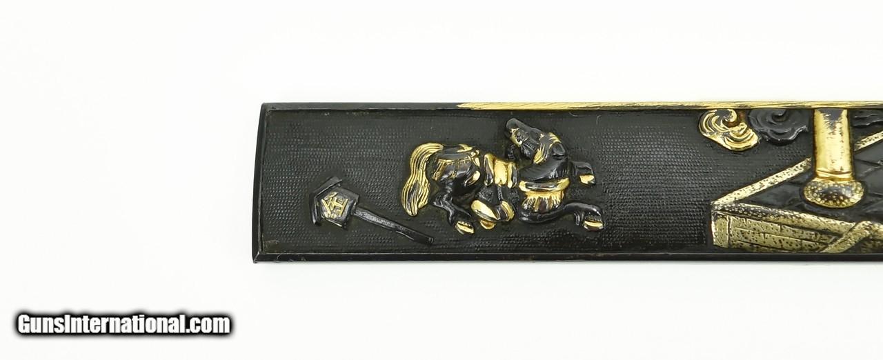 Description: "Kinko Kodzuka. Shakudo Nanako ground. Scene depicts a prancing Horse and a Samurai holding sword battling a Demon in swirling clouds. Signed: Goto with Kao. SOLD |