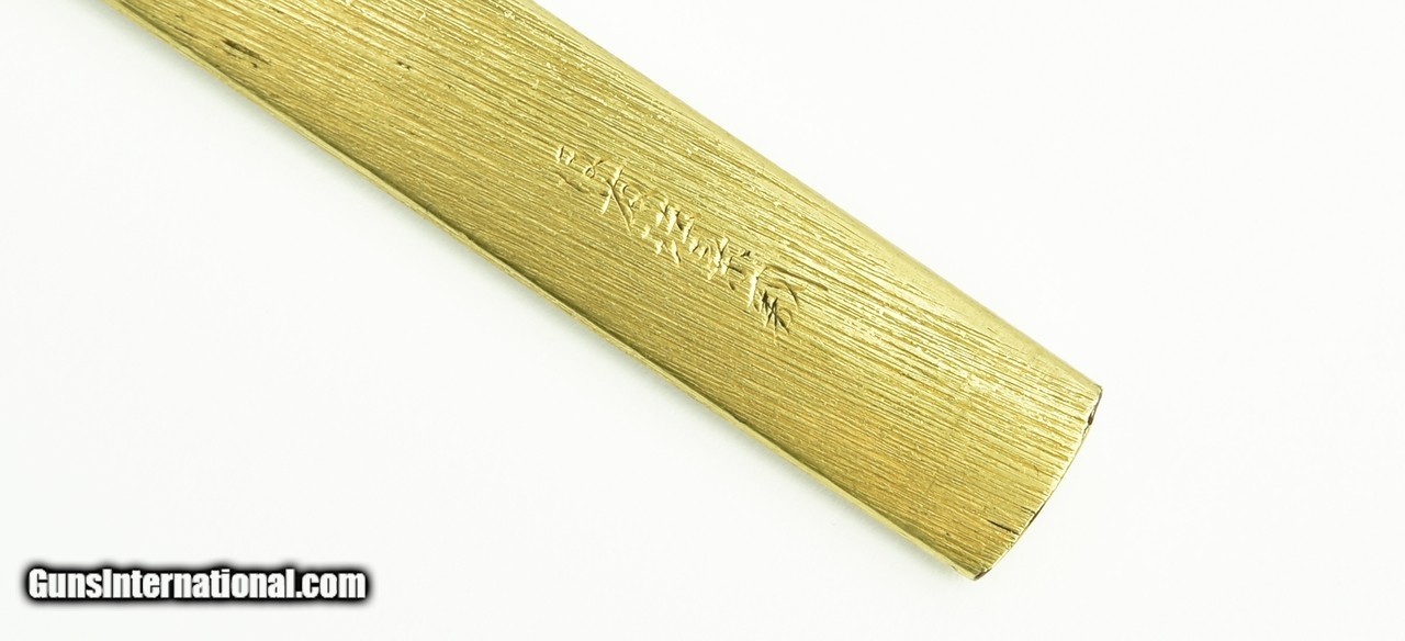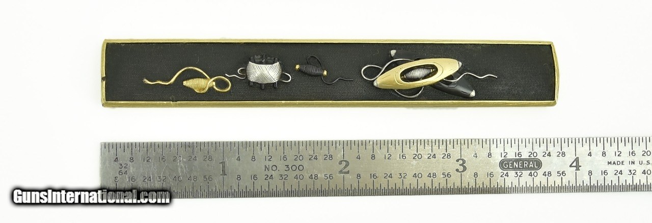 Description: "Kinko Kodzuka. Decorated with Spools of thread and Bobbins. Shakudo Nanako ground. Gold, silver, and Shakudo highlights. Signed: Goto Hojo. SOLD |