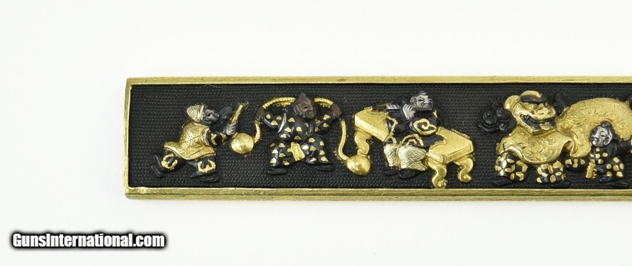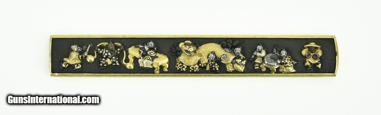 Description: "Kinko Kodzuka. Motif of Chinese boys engaging in dance with accompanying music. Gold, silver and Shakudo highlights. Shakudo Nanako ground. Reverse has gold cat-scratch pattern. Unsigned Goto School. SOLD |