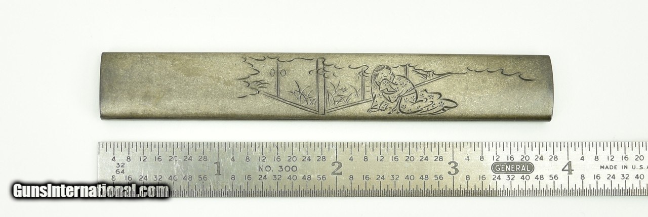 Description: "Kinko Kodzuka. Burnished silver Geisha in Kimono with portion of house in background. Signed: Goto Mitsu Yasu (1794-1851) Kinko Meikan Page 508a. SOLD |