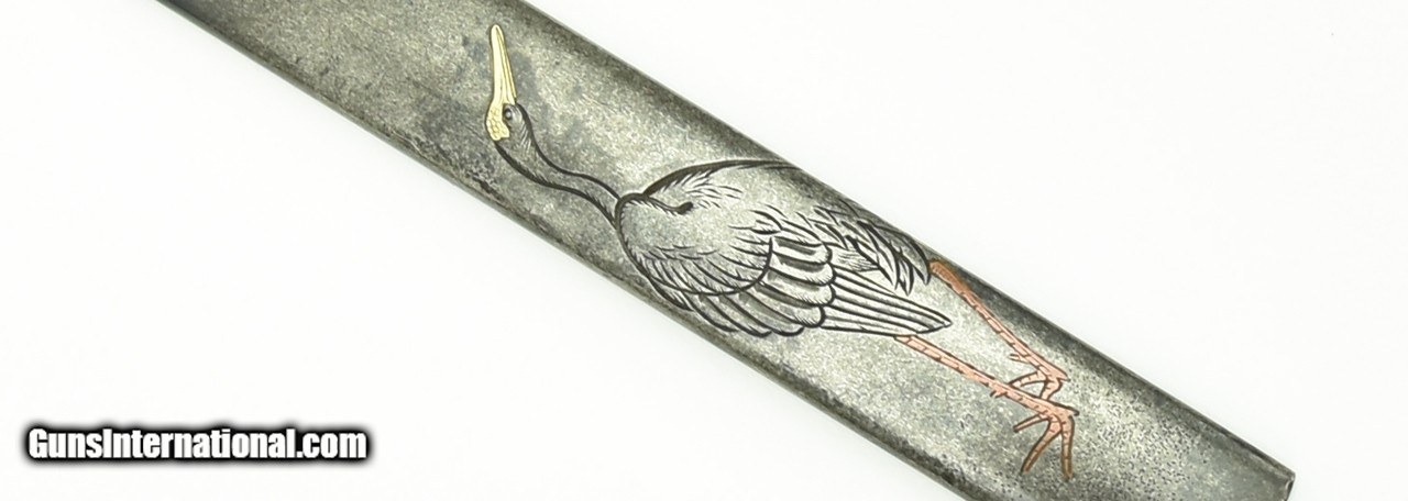 Description: "Kinko Kodzuka. Silver with crane carved in Katakiribori. Copper and gold highlights. Signed: Yusai. Dated Genji (1827-1899). Student of Wada Isshin. SOLD |