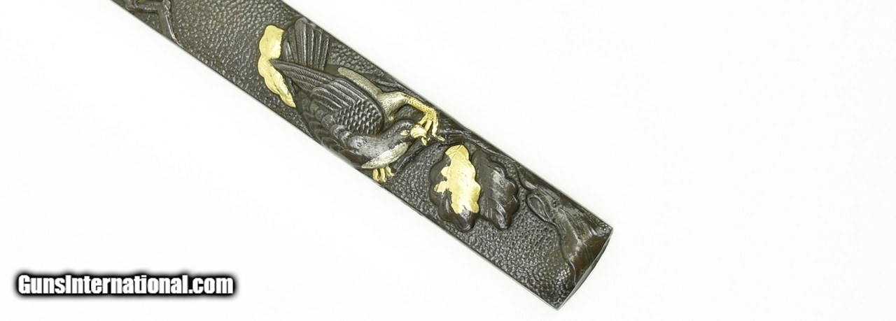 Description: "Kinko Kodzuka. Bird with foliage. Gold and silver highlights. Signed Haru Aki on side. (1789-1859). Pupil of Yanagawa Naoharu. Known as Shunai. Sosho Poem on reverse. SOLD |