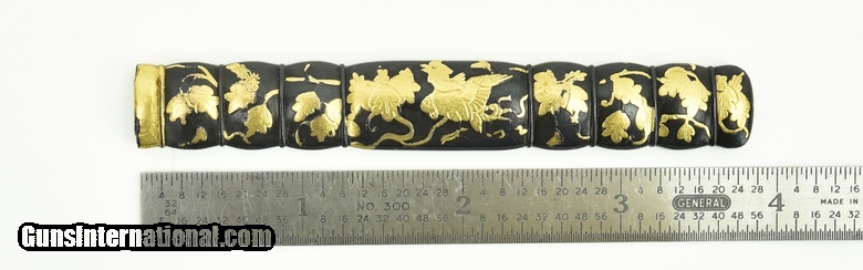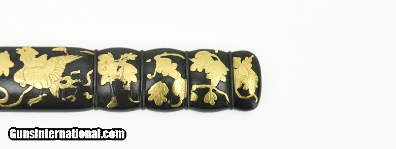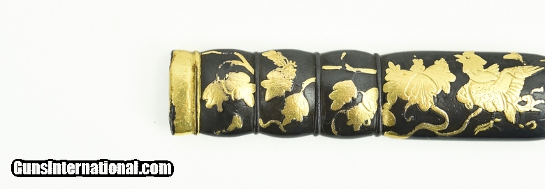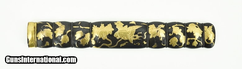 Description: "Kinko Kodzuka. Kaga School. Edo period (19th Century). Shakudo Migakiji lobed and decorated with a Phoenix in Paulownia and gold Hirozogan. Unsigned. SOLD |