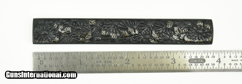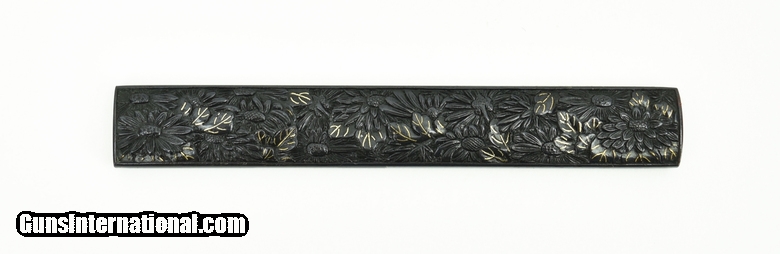 Description: "Kinko Kodzuka. In Shakudo intricately carved with Blossoming Chrysanthemums in Takabori. Veins of leaves inlaid in gold Hirazogan. Unsigned. Excellent condition. SOLD |