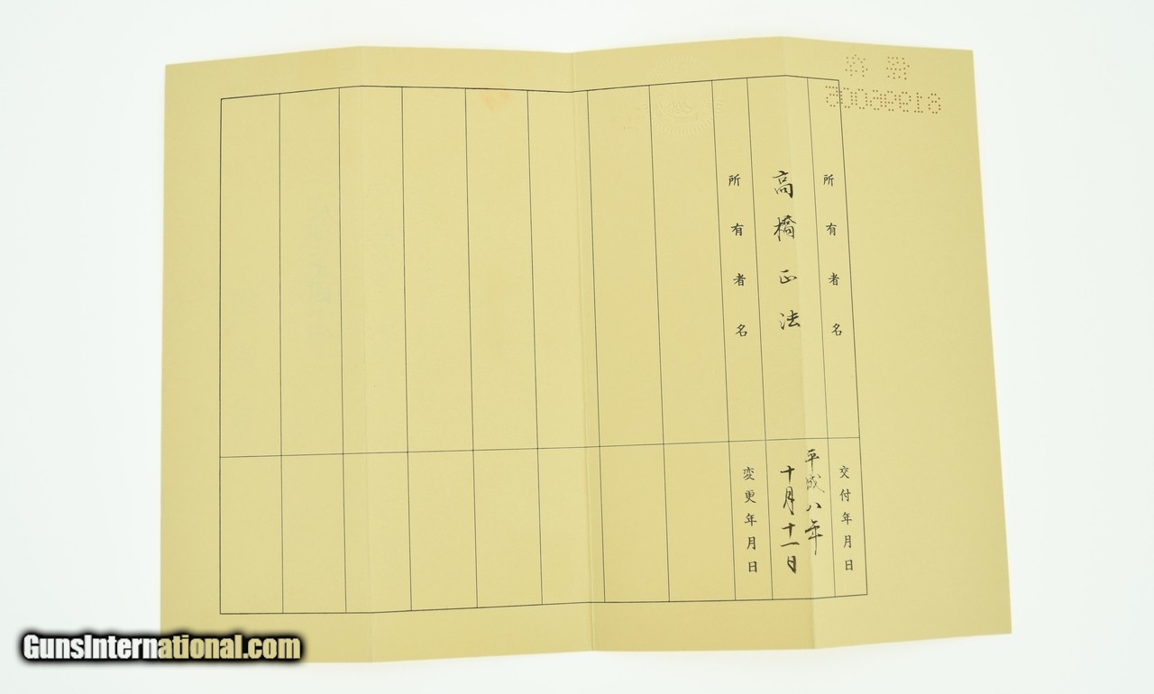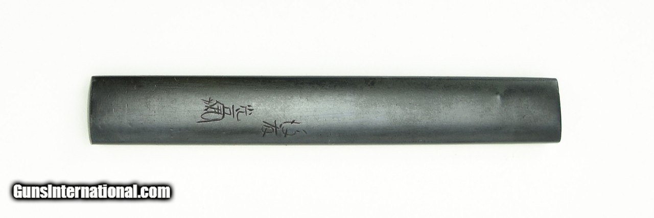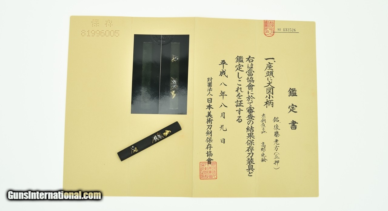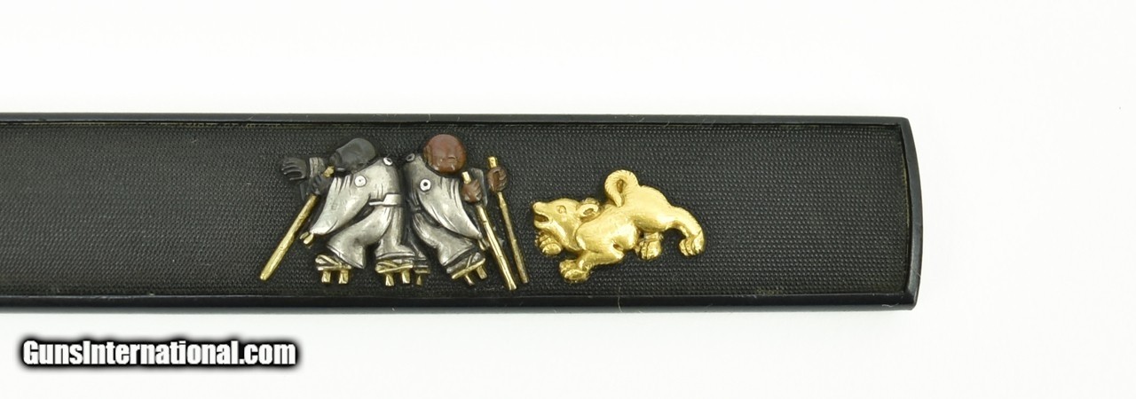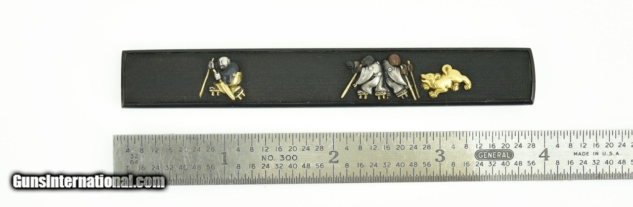 Description: "Kinko Kodzuka. Shakudo Nanako ground. Three blind men in gold and Shibuichi being harassed by gold barking Dog. Very fine work. Signed: Goto Mitsu Kata (1721-1784) year Edo period. N.B.T.H.K Hozon Paper. Art Name Enjo. SOLD |