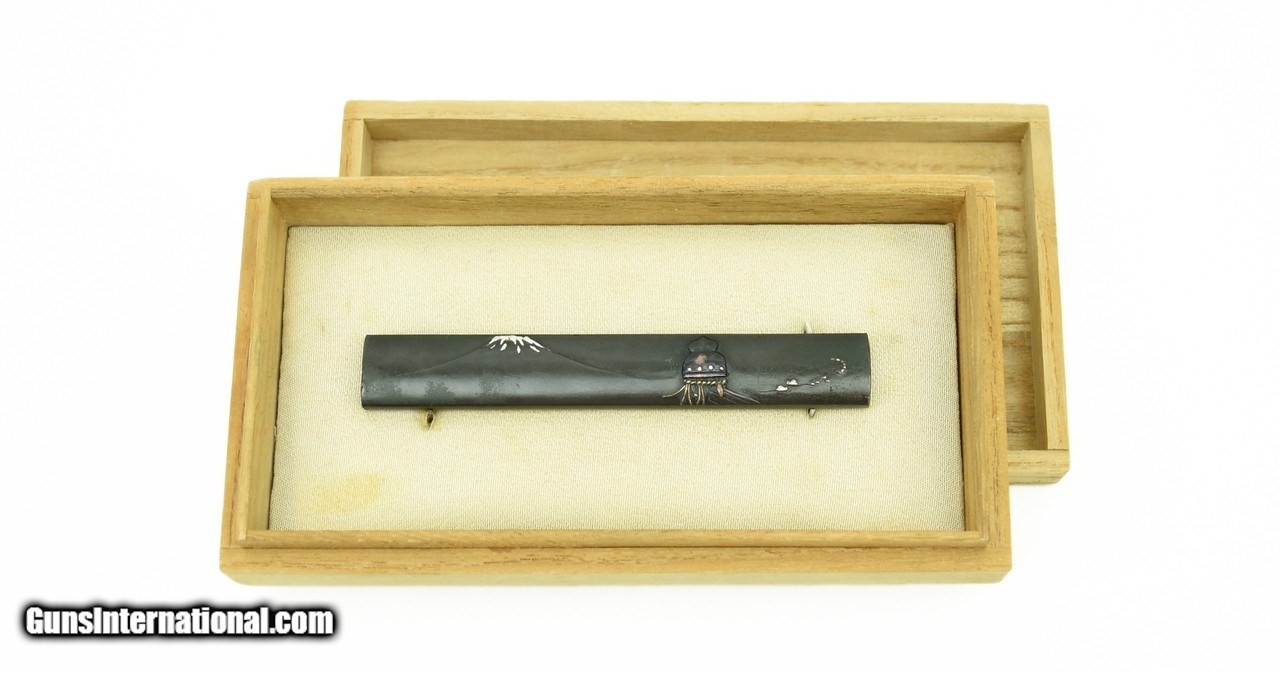 Description: "Kinko Kodzuka. Mountain Fuji with structure bridge with people on reverse. Unsigned. Shakudo ground. SOLD |