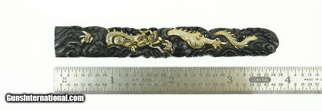 Description: "Kinko Kodzuka. Body of Kodzuka is shakudo with gold water dragon dipping in and out of waves. Reverse is cat-scratches in gold. Very attractive Kodzuka. Unsigned. SOLD |