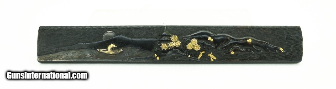 Description: "Kinko Kodzuka. Shakudo nanako ground. Sampan on water (water shibuichi) with a shibuichi moon rising above hills in background. Scene transitions to a pagoda surrounded by flowers leading to shakudo hills with gold accents. Signed Goto. Early Edo period. SOLD |