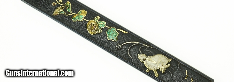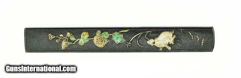 Description: "Kinko Kodzuka. Hirata School. Edo period. Shakudo with ishime ground. Decorated with rabbit and chrysanthemums in gold wire and polychrome enamels in high relief. Beautiful example of Hirata School work. SOLD |