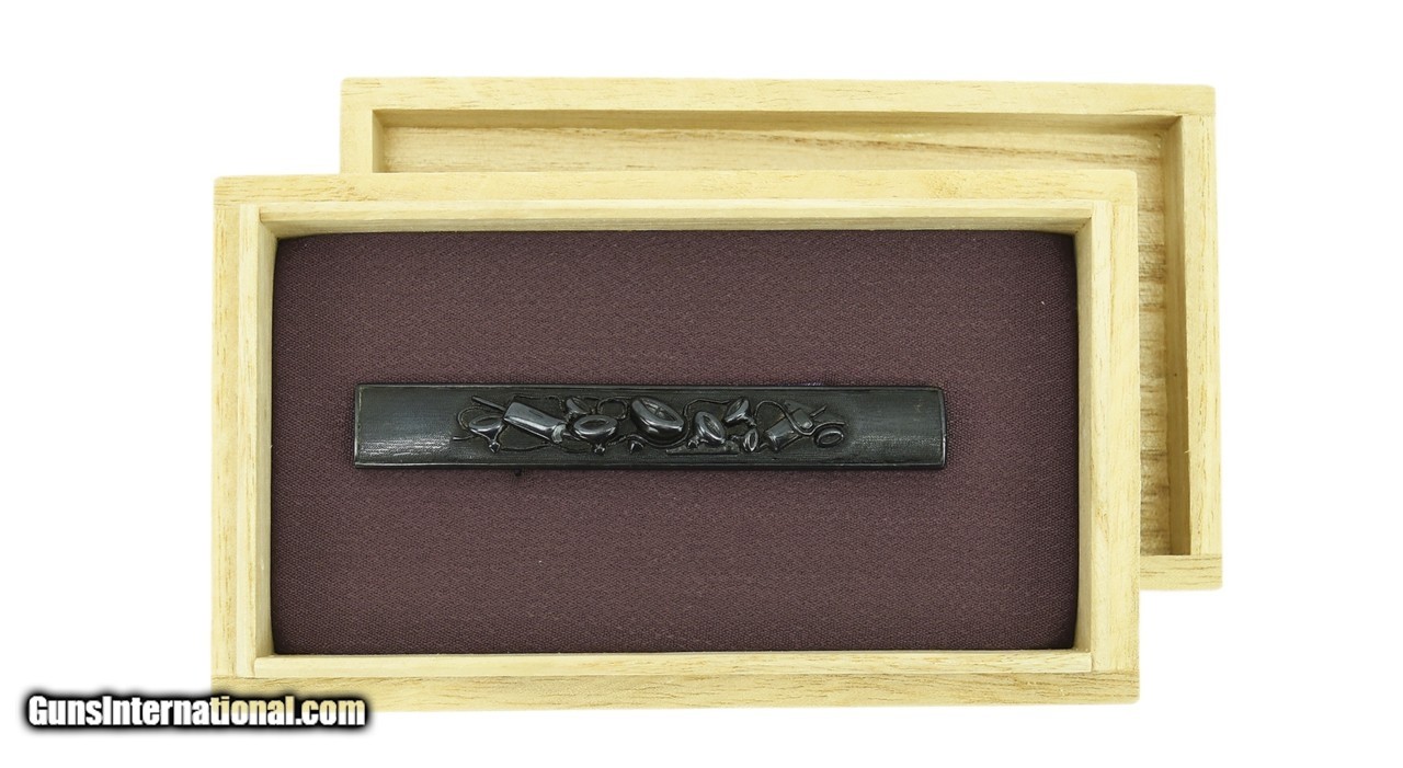 Description: "Kinko Kodzuka. Shakudo nanako ground. Decorated with a variety of spinning tops carved in high relief. Comes with Green certificate by N.B.T.H.K. attributing this to Ko-Goto (17th Century). SOLD |