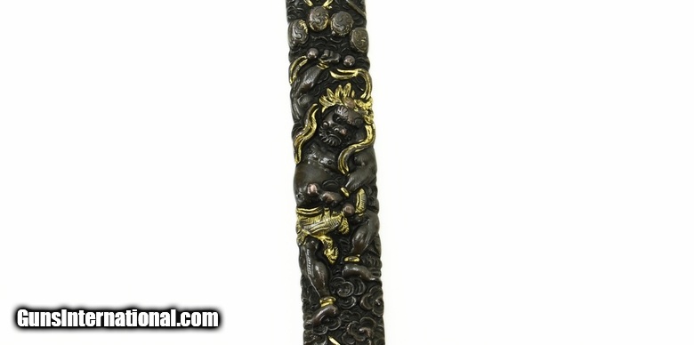 Description: "Kinko Kodzuka. Shakudo ground. Raijin, thunder god figure with gold highlights. No signature. SOLD |