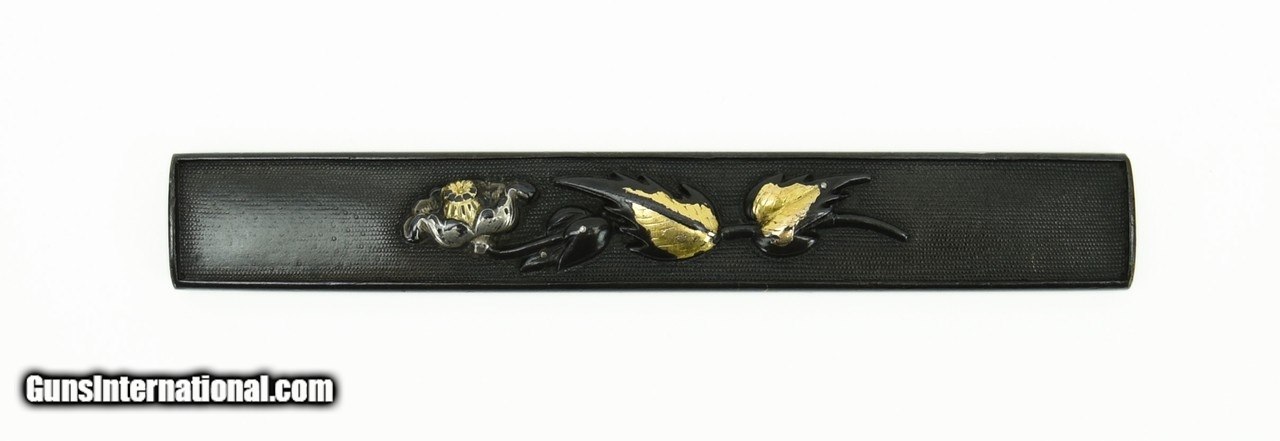 Description: "Kinko Kodzuka. Decorated with a blossoming camellia in high relief with gold, silver, and shakudo highlights. Signed: Goto Mitsu Yoshi (kao). Art name: Goto Shinjo (1780-1843). Comes with N.B.T.H.K. Hozon Tosogu, dated 1984. SOLD |