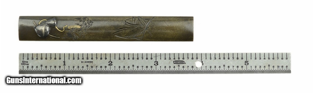 Description: "Kinko Kodzuka. Shibuichi ground. Comb hat and shakudo and gold highlights. SOLD |