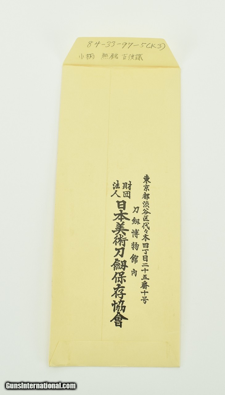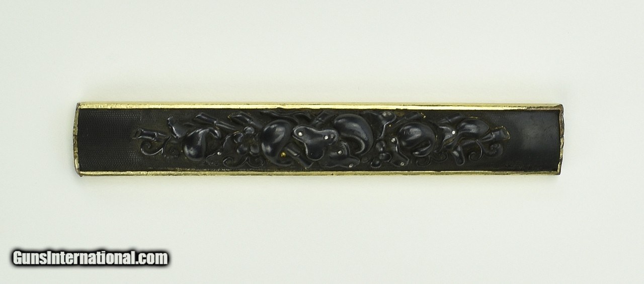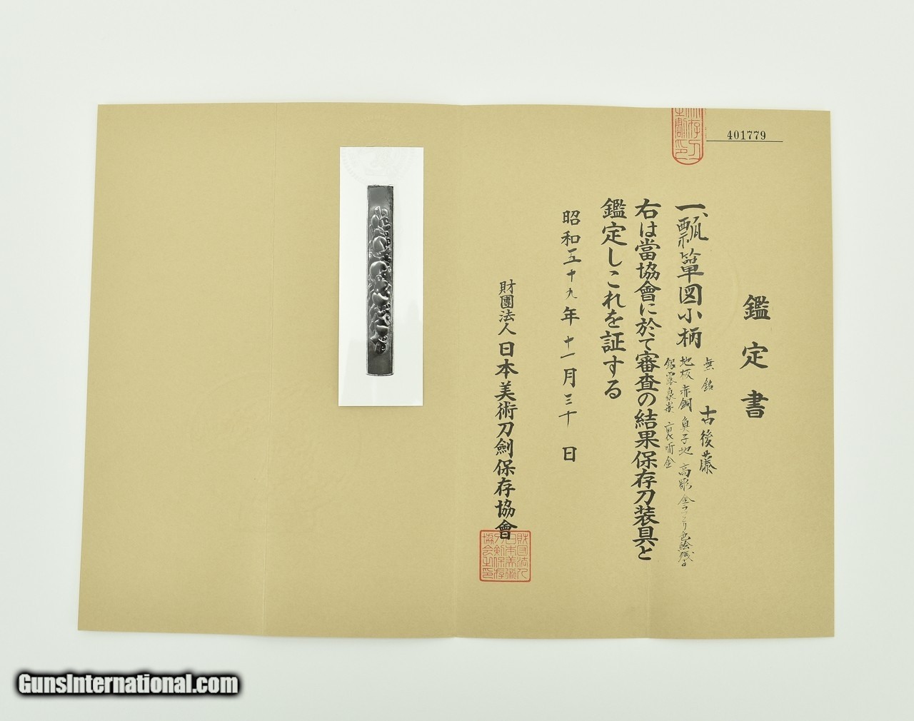 Description: "Kinko Kodzuka. Polished shakudo ground. Gourds on vines on trellis in high relief with gold highlights. With N.B.T.H.K. Hozon certificate. Ko Goto Kodzuka. SOLD |