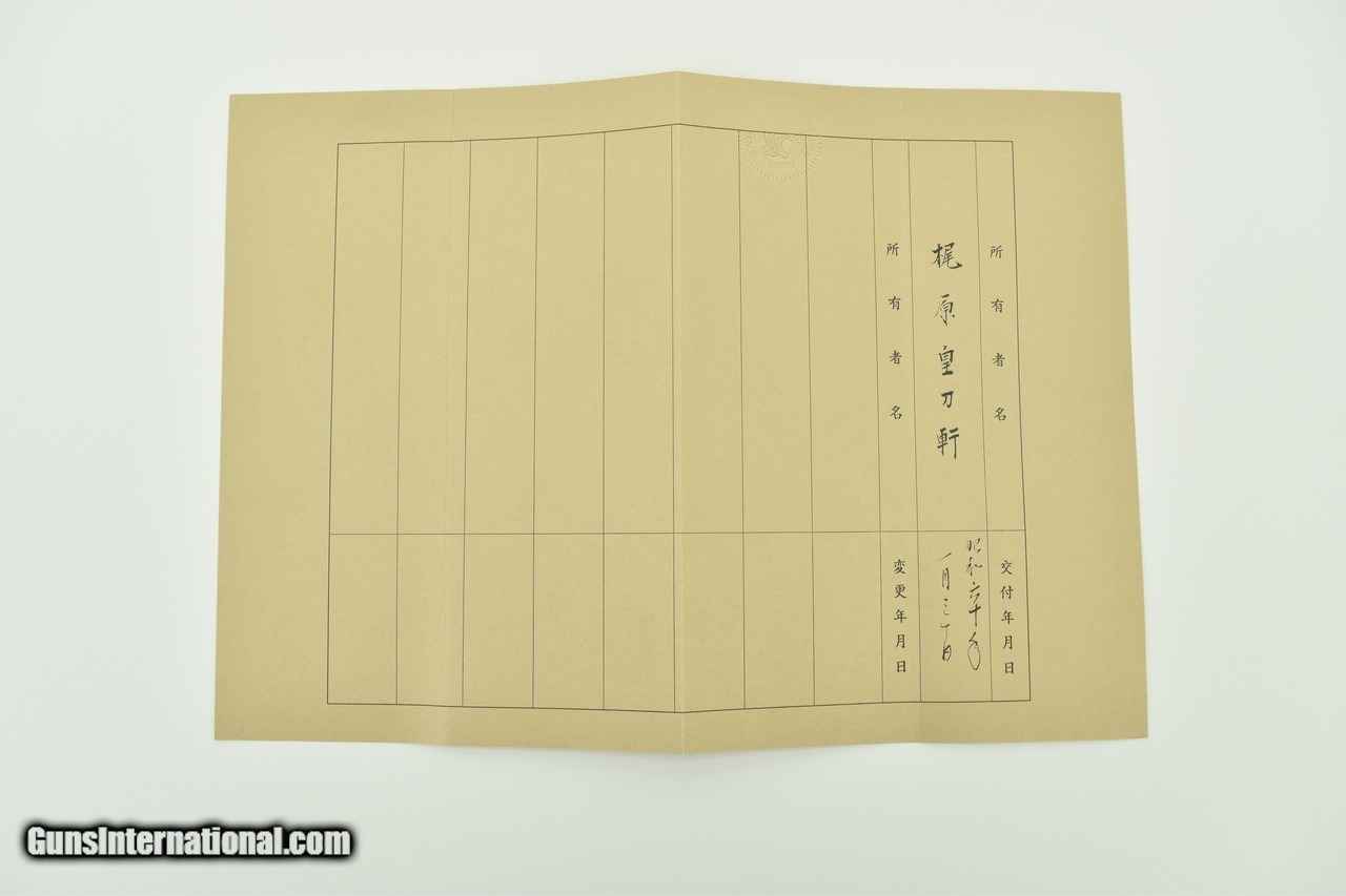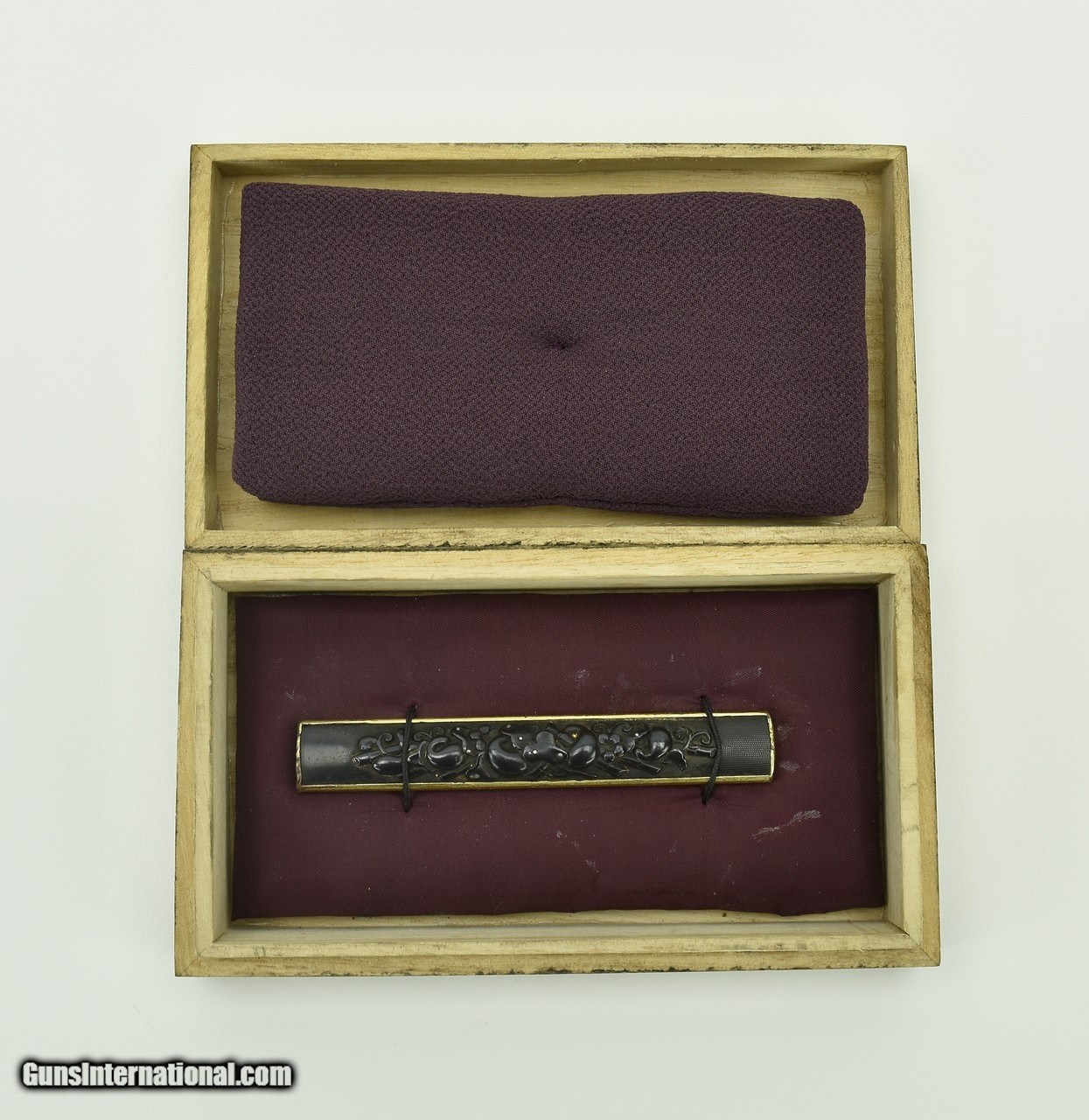 Description: "Kinko Kodzuka. Polished shakudo ground. Gourds on vines on trellis in high relief with gold highlights. With N.B.T.H.K. Hozon certificate. Ko Goto Kodzuka. SOLD |
