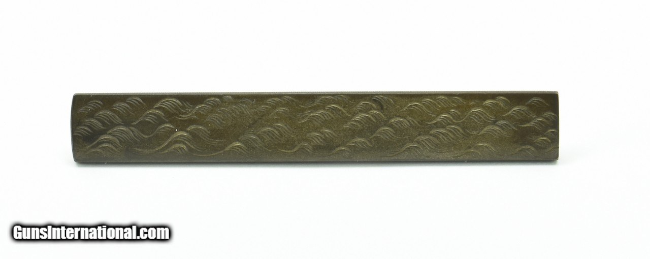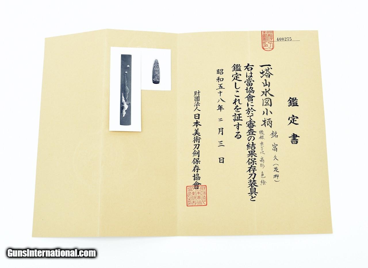 Description: "Kinko Kodzuka. Shibuichi Nanako Ground. Obverse has small mountain island with shibuichi temple behind a gold island and with an even smaller shakudo island in the foreground. Reverse is covered in a “wave" pattern. Signed on the closed end. Tomi Hisa-with N.T.H.K. certificate. SOLD |