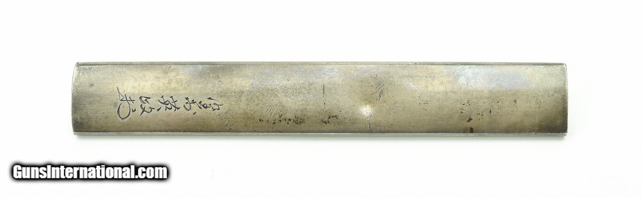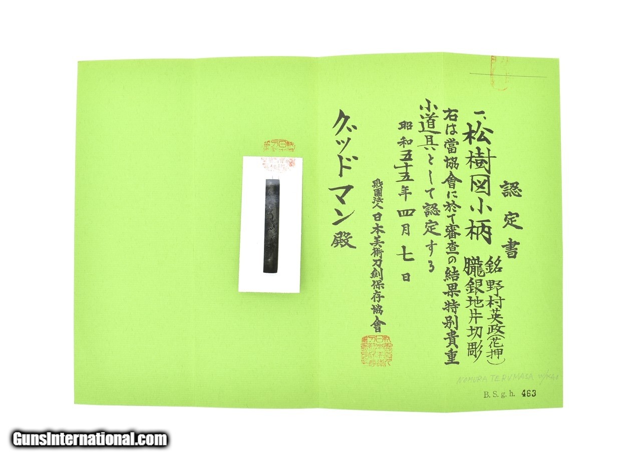 Description: "Kinko Kodzuka. Polished silver ground pine is deeply carved with gold accents. Pine needles are more lightly engraved. Dent is on reverse. Signed: Nomura Teru Masa. N.B.T.H.K. certificate. SOLD |