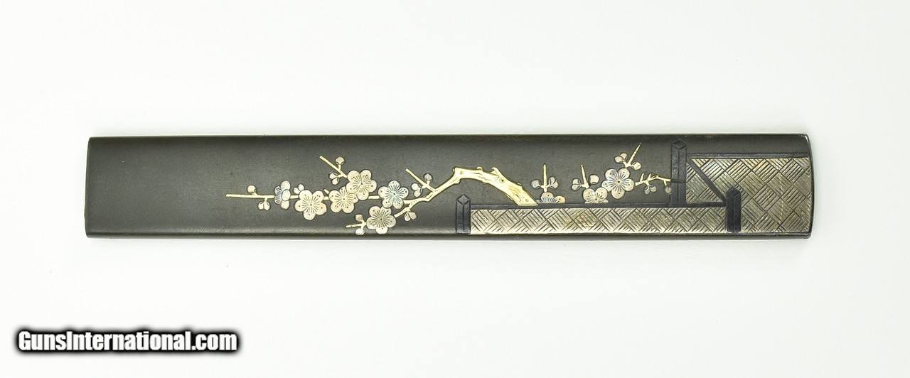 Description: "Kinko Kodzuka. Flowering plum tree behind an ornate checkered criss-cross wall of silver against a shakudo background. Flowers are silver and branches are gold. Unsigned but attributed to the Kaga School by the N.B.T.H.K. Ex-Stanly Kellert Collection. SOLD |
