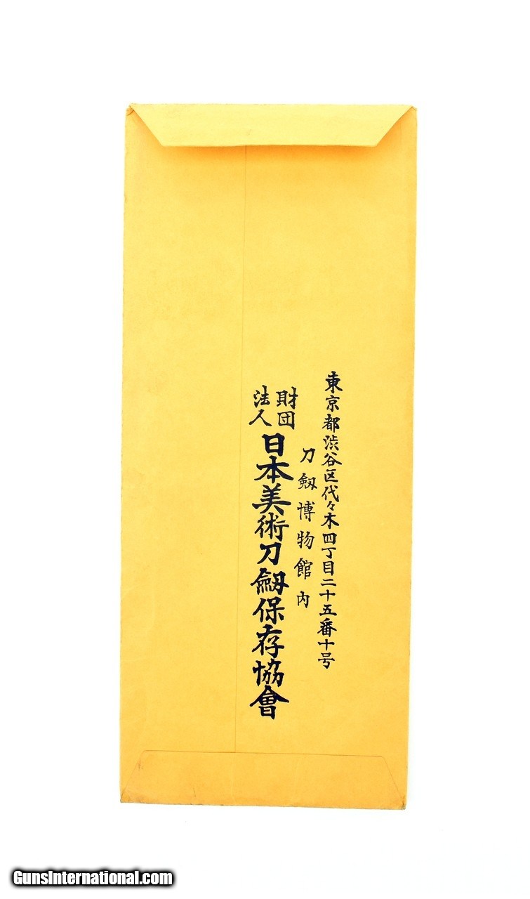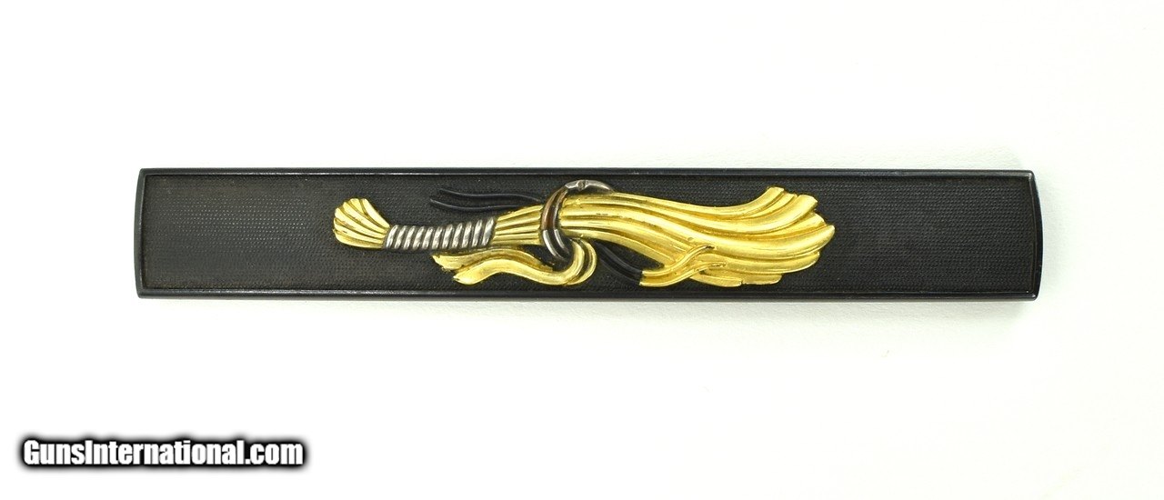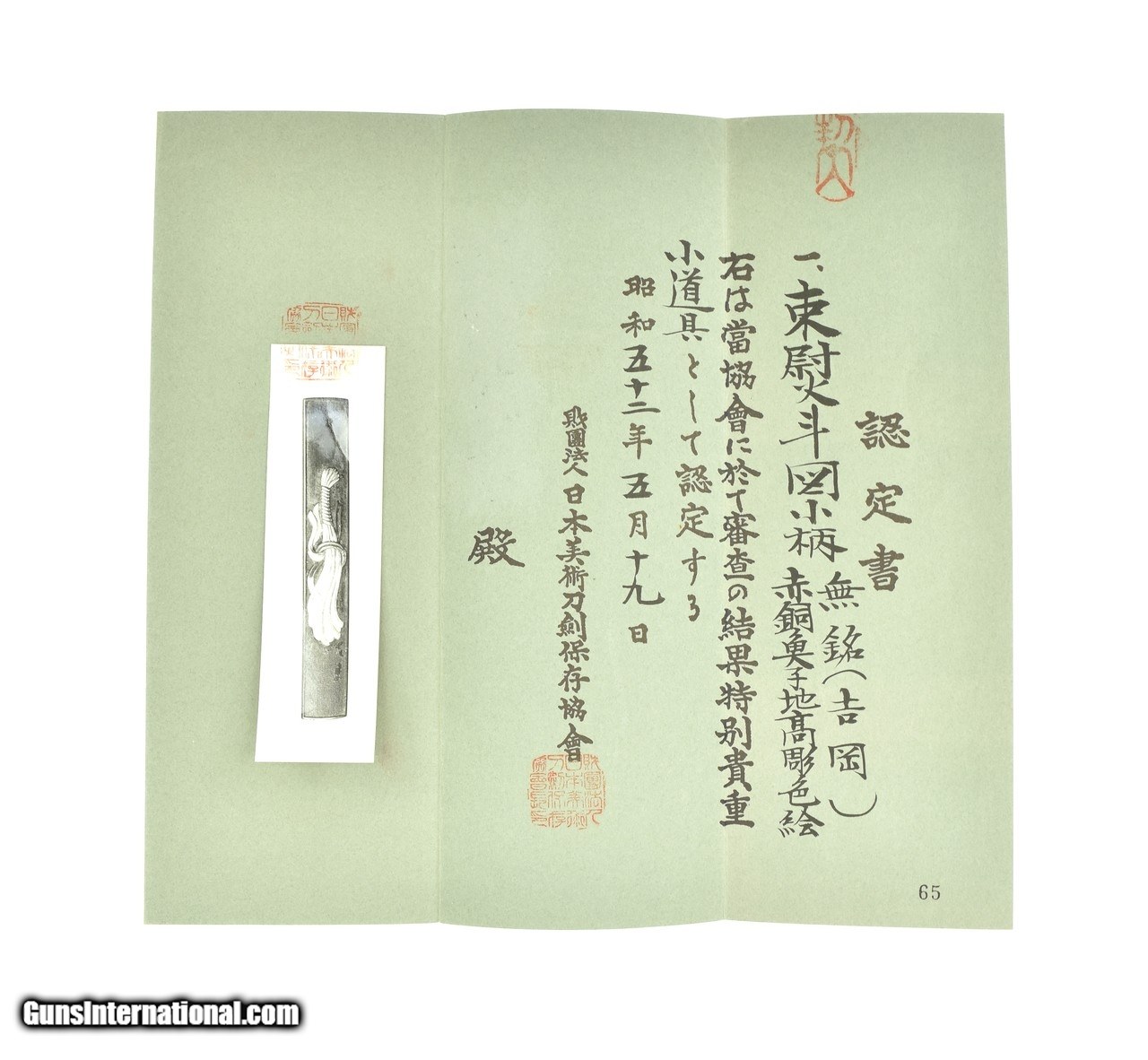Description: "Kinko Kodzuka. Shakudo nanako ground depicting a whisk (possibly fly whisk) gold, silver and copper. Unsigned (Mumei). This is a very pleasing motif. The high quality work and fine nanako will make you smile! With N.B.T.H.K. certificate. SOLD |