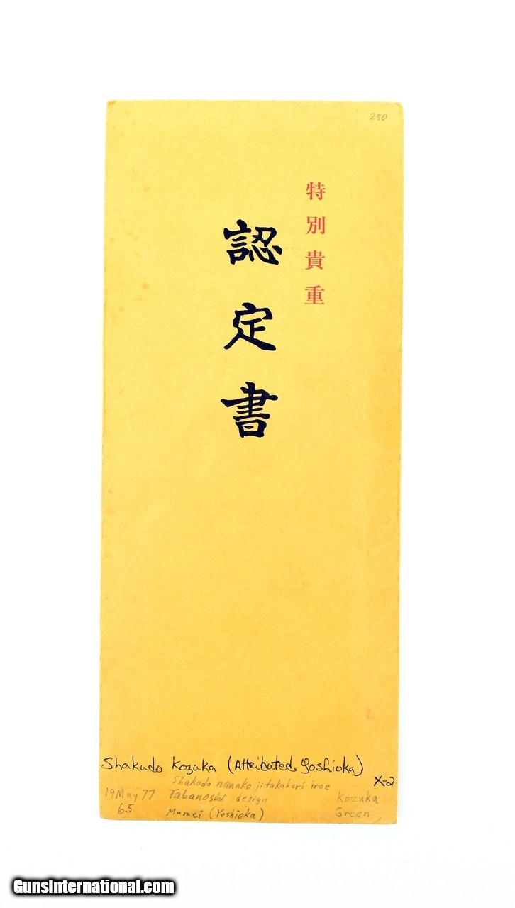 Description: "Kinko Kodzuka. Shakudo nanako ground depicting a whisk (possibly fly whisk) gold, silver and copper. Unsigned (Mumei). This is a very pleasing motif. The high quality work and fine nanako will make you smile! With N.B.T.H.K. certificate. SOLD |